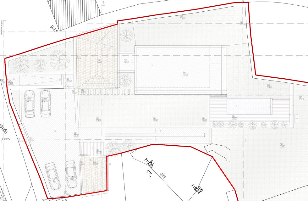 A nível de arranjos exteriores, apresentamos várias zonas propostas. A zona de entrada pedonal e acesso principal ao terreno, alinhada pela frente da habitação. Paralela à zona pedonal, separada por um murete em granito, definimos uma larga zona de estacionamento privativo exterior, pavimentada em cubo de granito assente em terreno natural. A partir da zona de estacionamento definimos um percurso interno que facilitasse o acesso a eventuais alfaias que sejam necessárias para o trabalho agrícola na zona do terreno que será cultivada. Para além deste acesso, criamos também um acesso alternativo/secundário para zona de estar, social e de lazer da habitação, incluindo a plataforma da piscina exterior. Todos estes percursos e acesso pretendem ser o menos intrusivos possível no terreno natural, deixando o máximo possível de terreno possível sem intervenção e projetado para ser cuidado a nível de flora.